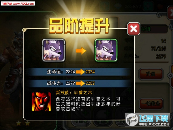 點擊英雄頭像即可進入詳細頁麵,在這裏玩家可以查看英雄等級、當前經驗、戰鬥力、星級、品質、纖細屬性以及技能等級等情況,並且可以進行裝備,進階,進化等操作。