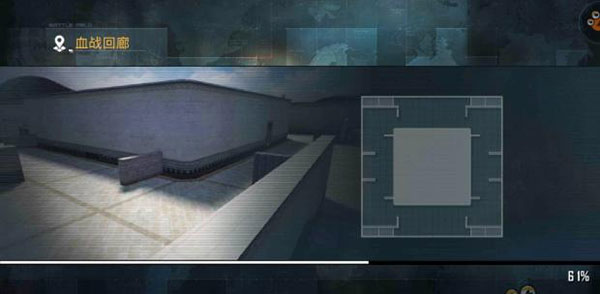 血戰回廊地圖為正方形地圖,在出生點的左右麵的區域各有4塊掩體,正方形的四角各有一塊大掩體。