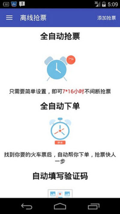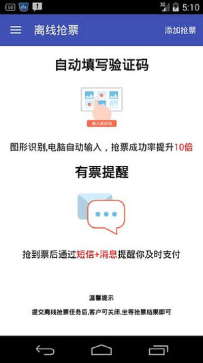 獨家支持離線搶票功能,從此擺脫從早到晚在電腦前刷票的煩惱。(使用離線搶票服務應用無需開啟)購票成功後,短信 + 係統通知(雙保險)通知用戶盡快支付票款。