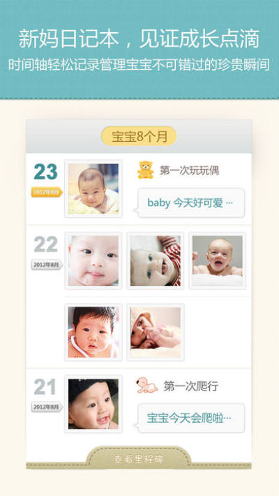 時間軸與自動提醒功能讓你輕鬆記錄並管理寶寶每一個不可錯過的珍貴瞬間,見證你與寶寶一同成長點滴。