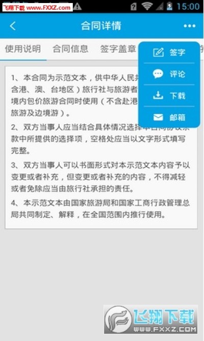 戶可以使用智能手機下載旅遊電子合同app客戶端。使用電子合同手機客戶端掃描電子合同二維碼可查詢合同真偽,同時旅遊電子合同app手機客戶端可以進行電子合同手機簽名、意見反饋、合同意見查詢等。