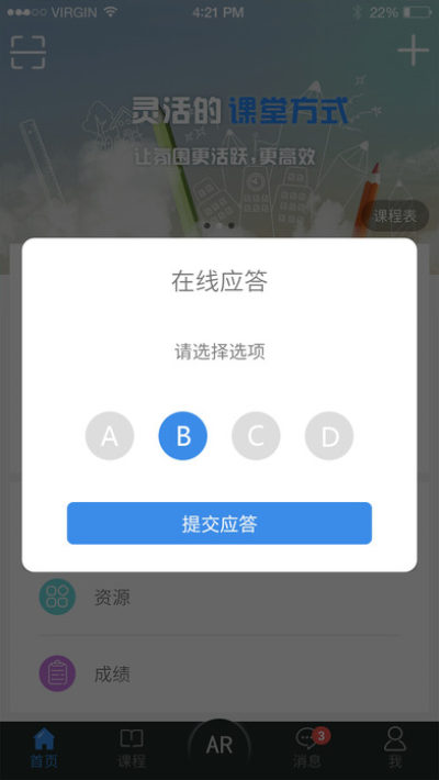 本軟件的主要功能模塊包括:組建課程和班級、簽到和通知、布置作業、組卷和隨堂應答,平時成績統計。教師不用批改作業,不用回帖,一切盡在掌握之中,為教師即時提供學生對知識的掌握情況。對學生來說,也是幫助學習的一大利器。再也不為聽不懂發愁了,打開您的書本,找到不理解的地方,掃一掃那個二維碼或帶有App標記的圖片,將引導你生動有趣地、直觀通俗地學習一遍。同時,這也是一件考試通過的助力神器,老師布置的作業,很可能就是要考的,神器裏幫你永久保存著,還提供正確答案呢。