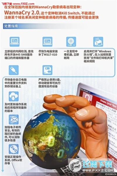 國家網絡與信息安全信息通報中心緊急通報:監測發現,在全球範圍內爆發的WannaCry 勒索病毒出現了變種:WannaCry 2.0, 與之前版本的不同是,這個變種取消了Kill Switch,不能通過注冊某個域名來關閉變種勒索病毒的傳播,該變種傳播速度可能會更快。請廣大網民盡快升級安裝Windows操作係統相關補丁,已感染病毒機器請立即斷網,避免進一步傳播感染。