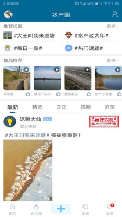 2 【水產圈】誰說水產養殖隻有風吹日曬,滿身泥漿,山腳下泛著銀光的池塘,養殖車間裏冒著泡的水流,喂料時熱鬧的魚群,出魚時豐收的喜悅,這些美好感動的瞬間可以通過水產通app記錄分享!