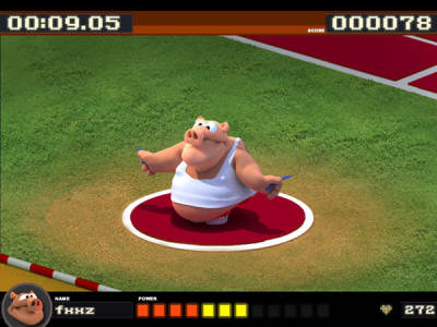 一開始還在想遊戲為什麼要用這麼醜的一隻豬做主角,真正玩起來之後才發現原來用一隻胖胖的肥豬做主角參加運動會做體育運動是一件多麼有喜感的事情啊。在遊戲中它會參加多個體育項目,有跳繩、跨欄、跳遠、標槍、鏈球等等,不過遊戲中我們除了他看不到其他選手。玩家可以將取得的成績保存到得分榜上和全世界的玩家比賽,不過這裏要提醒的是遊戲中要注意鍵盤的使用,不要用力過猛損壞鍵盤哦。