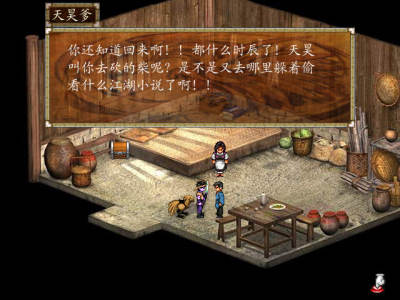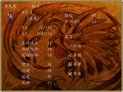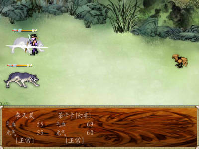 遊戲一開始進入村子之前會遭遇兩場與狼的戰鬥,非常靠運氣。隻要主角的攻擊有兩下沒有打到野狼就很有可能GAME OVER了。進入李家村的劇情後,老爹會給你一本李家槍譜,拿到之後在背包裏趕緊學習,之後的戰鬥會簡單許多。