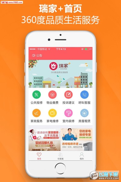 瑞家家app包含繳物業費、繳停車費、投訴報修、社區公告、周邊優惠、二手交易、鄰裏圈、充值中心、機票、旅遊酒店、招商加盟等,旨在為業主提供衣、食、住、行、娛、教育、健康的等全生命周期的服務。