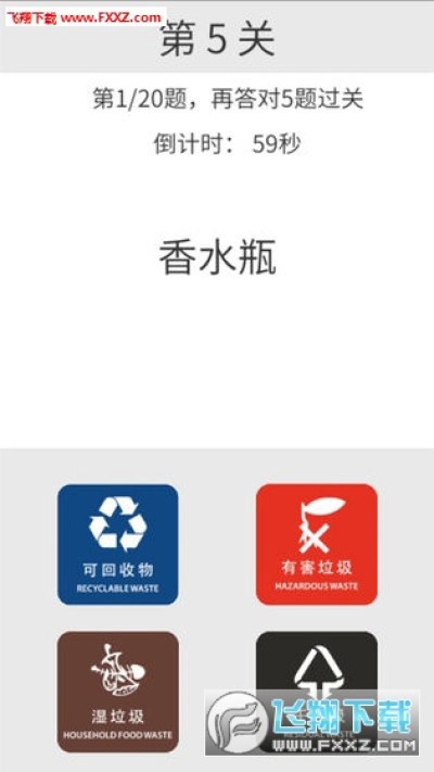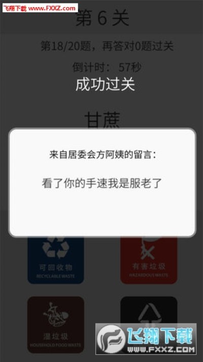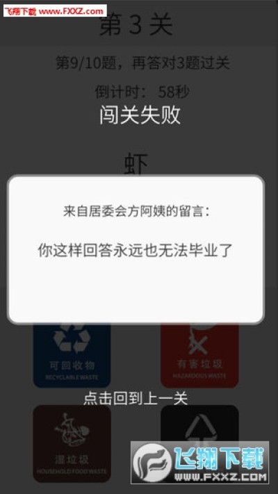 在遊戲中,你需要為題目中的垃圾選擇正確的分類,如果在一分鍾內完成相應的題目,才能進入下一關,如果失敗了,會回到前麵的關卡重來,這是一個非常嚴格的訓練。