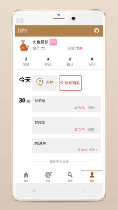 4.我的,在這裏你可以查看自己的問題,查看自己收藏的夢境。也能把自己喜歡的內容分享給你的朋友們;