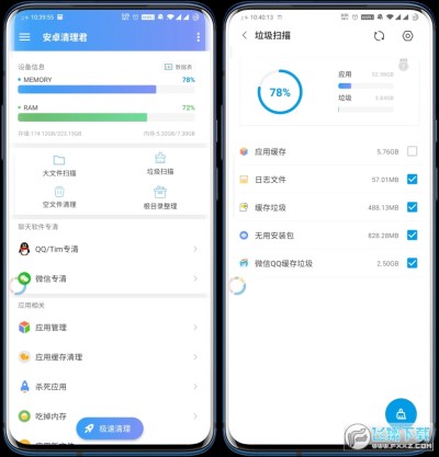 垃圾清理顯示應用各自垃圾大小,高級清理能夠找到後台耗電的應用。一鍵清理,讓手機瘦身,給電池續命。