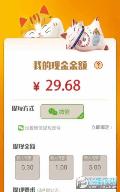 招財小貓咪玩遊戲賺現金,新用戶下載招財小貓咪APP,微信登錄後立即獲得5000喵幣,相當於0.5元,可用於提現,不過首次隻能提現0.3元,親測秒到微信零錢,之後還有0.5元、1.5元、3元等低門檻提現機會。玩合成小遊戲,歡樂搶紅包,合成最高級還有機率獲得分紅喵,躺著領分紅。
