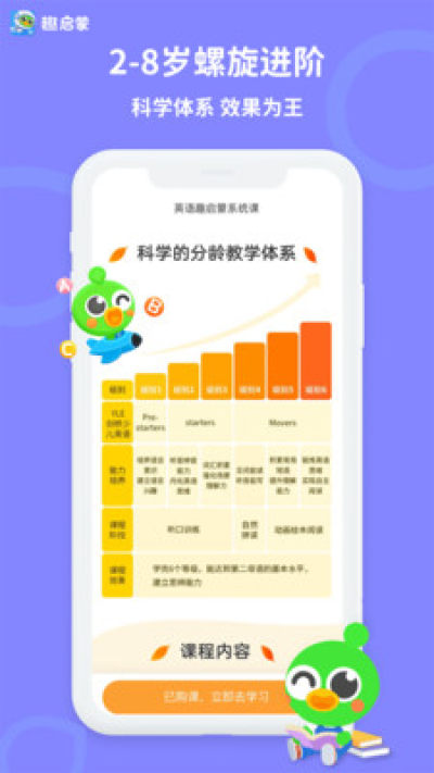 趣啟蒙專為2-9歲兒童家庭提供一站式的在線英語啟蒙服務。課程采用暢銷全球的的啟蒙教材,貼合2-9歲兒童認知發展規律,通過幽默風趣的真人動畫課堂和科學有趣的教學方式,讓孩子感受到英語學習的樂趣,從而愛上英語。結合配套的繪本、樂器,兒歌、配音,不斷的重複學習,幫助孩子增強記憶、活學活用。