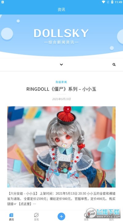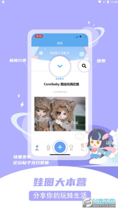 Dollsky app是玩偶天空推出的手機客戶端,為各位用戶提供各種玩偶的信息,也是玩偶愛好者的交流平台,在Dollsky玩偶天空app上用戶可以查看各種玩偶的美圖,還有最新新品的發售等等,快來試試吧!
