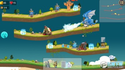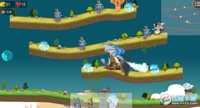 玩法:塔防,四種塔,兩種是兵種塔,另外兩種都是功能塔,兵種塔就是常規的近戰塔和遠程塔,功能塔比較有意思,彈簧塔可以讓近戰兵種攻擊到飛行怪,雲塔可以運載兵種達成一個援兵的效果