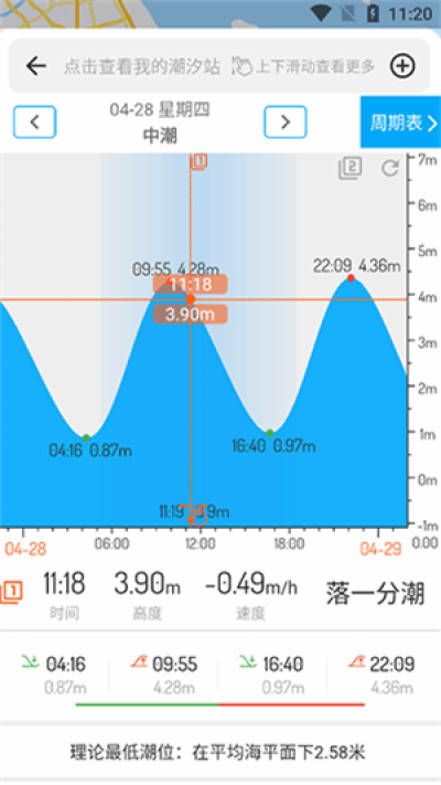2、點擊進入後就可以看到當天內的漲潮時間了,紅色為漲潮,綠色為退潮