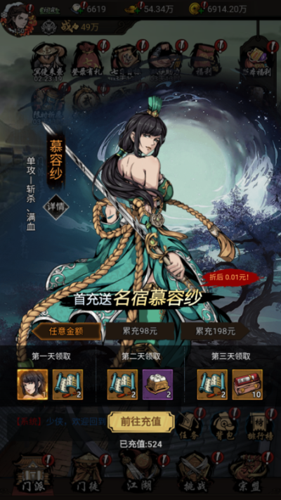 奇門飛花令0.1折千元免費版折扣版是一款武俠風格的放置RPG手遊,玩家需要按照任務指引進行闖關,通過擊敗怪物與BOSS來獲得經驗與獎勵,每日呼呼呼去無限資源特權和現金券,每日送十連還有全場0.1折的充值福利,想要體驗的小夥伴們快來試試吧!