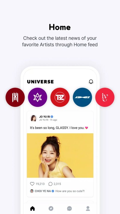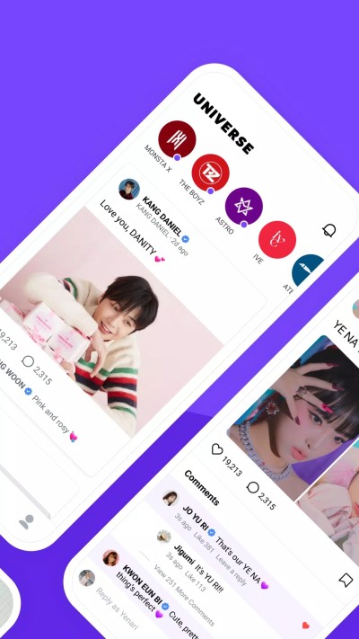 UNIVERSE官方安卓下載最新版為全球粉絲提供一個多合一的互動體驗。在這裏,您可以與您的偶像無縫連接,享受獨家內容,參與各種活動,並與其他粉絲共同構建屬於我們的宇宙。通過Home & Discover板塊,您可以訂閱並快速查看您最喜愛的藝術家的最新消息。這些消息包括獨家內容、社區動態和活動信息,確保您比任何人都能更快地了解偶像的最新動態。