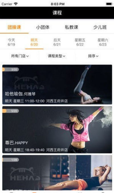 嘿哈貓健身app有團操可、私教課、少兒班等針對不同人群的課程。