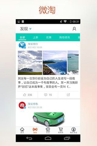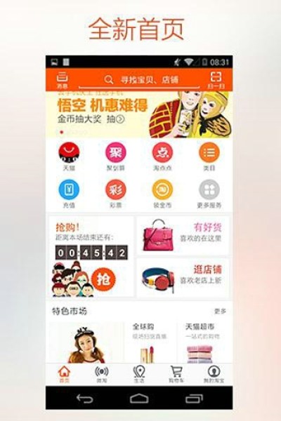 淘寶Android手機客戶端是淘寶網官方推出的提供給用戶使用的手機購物軟件,為用戶提供快捷方便的手機購物新體驗。Android2.0全新的界麵展示,讓您逛的開心,買的放心;新版本還具備“七種神器”,捕獲您的“芳心”, 並支持旺旺聊天、支付寶一鍵支付、淘寶商城品牌正品選購,讓您無時無刻每時每刻樂淘其中!手機客戶端依托淘寶網強大的自身優勢,整合旗下團購聚劃算、品質保證淘寶商城、商品品類豐富的淘寶集市為一體,為用戶提供更方便快捷流暢、隨時隨地進行移動購物的完美體驗,軟件還具有搜索、比價、物流訂單查詢、安全支付寶支付、收藏評價、我的動態、導航、打折促銷、手機專享、購物車合並付款等功能。