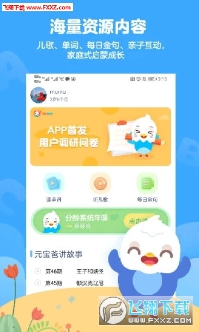 ·登錄主界麵可查看到豐富的學習資源,包括兒歌、故事、閃卡。有效的磨耳朵能夠幫助孩子培養出好的語感。