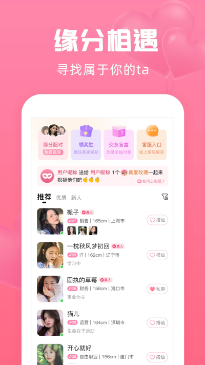 -真誠安全:采用AI算法+人工24小時審核,拒絕機器人不回複/不真誠的交友行為,保障用戶的交友體驗。