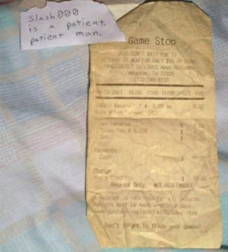 參考閱讀:讀國外一個網名叫Slash000的玩家在2001年預訂了《永遠的毀滅公爵》,當時價格是10美元,不知道GameStop如今會不會承認這張收據了。。不得不說這個Slash000耐心真的不錯,下麵就是這張收據的圖片: