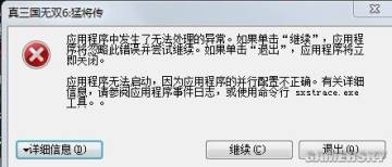 《真三國無雙6》“應用程序的並行配置不正確”無法運行遊戲的解決方法 來源: 飛翔小編 2012/3/12 9:18:25 瀏覽量:14383 很多玩家下載了《真三國無雙6》遊戲後在安裝遊戲時都提示“應用程序的並行配置不正確”等,然後就沒法安裝遊戲了,現在告訴大家真正的原因所在。 《真三國無雙6》遊戲運行提示錯誤如下圖: 隻要出以上錯誤的朋友都是配製環境錯誤,因為這款遊戲必需日版VC2005才能正確運行遊戲,目前90%的出錯原因均在此。所以大家隻要下了日版VC2005才能正確解決這個問題。 日版VC2005下載地址:http://115.com/file/besiev4e#