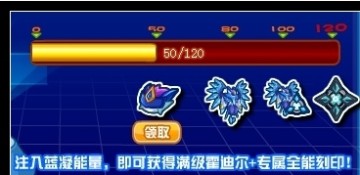 收集到50點藍凝能量可領取霍迪爾精元,收集80點藍凝能量可領取80級霍迪爾精靈,收集100點藍凝能量可領取滿級霍迪爾加專屬刻印,收集120點藍凝能量可領取惡靈獸專屬刻印。