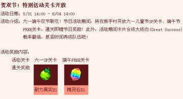 《鎖鏈戰記》2014年兒童節端午節特別活動開啟 來源: 飛翔小編feichenpan 2014/5/28 10:24:33 瀏覽量:402 卡牌手遊《鎖鏈戰記》為迎接即將到來的2014年六一兒童節和端午節,節日活動期間將開放兒童節和端午節特殊副本關卡,通關還有豐富獎勵附贈,此外活動期間卡片合成大成功幾率翻倍,各位玩家不要錯過了。《鎖鏈戰記》2014年兒童節端午節特別活動: