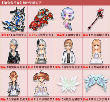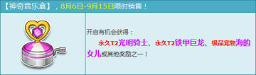 8月6日-9月15日,隻需要在商城購買“神奇音樂盒”(售價10QB),開啟就有機會獲得永久T2機甲、極品寵物、極品套裝、極品背飾、極品手杖或其他獎勵之一。