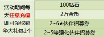 活動期間,通過遊戲內任意充值,即可立刻通過郵箱額外領取豪華大禮包一個。該活動每天可參與一次,獎勵內容如下: