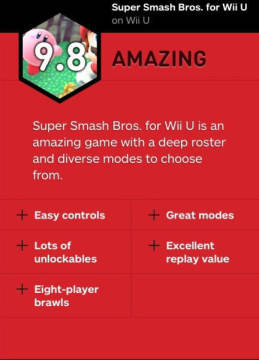 《任天堂全明星大亂鬥WiiU》美版現已正式發售,國外著名評測媒體IGN給予其9.8分的超高評價,認為該作WiiU版任天堂全明星大亂鬥參戰陣容豐厚,可選擇模式也豐富多彩,絕對是一款令人讚歎的遊戲,其優點在於操控易上手,十分出色的各類模式,大量可解鎖內容,重複遊玩價值很高,以及支持8人大亂鬥。