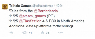 Telltale Games於幾分鍾前在推特上發布推文,確認《無主之地傳說》將於11月25日通過Steam登陸PC,同時還將登陸PS3和PS4平台,其他平台和日期將後續公開。