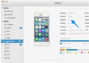 1、這裏以PP助手為例,先把iPhone用原裝數據線連接電腦,打開PP助手,點擊左側的iPhone一欄,會在右窗格中看到機器的相關信息,可以看到是否越獄一欄顯示“是”,如圖所示。