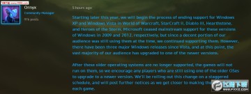 今年晚些時候,我們將開始結束windows XP以及vista對魔獸世界、星際爭霸2、暗黑3、爐石傳說和風暴英雄的支持。微軟分別在09年和12年結束了對這兩款係統的支持,但是由於我們還有一部分玩家在使用這兩款係統,我們當時還繼續支持他們。但是不管怎麼說,自從vista之後已經有三款主流係統發布了,並且現在絕大多數玩家已經升級為其中之一的版本。