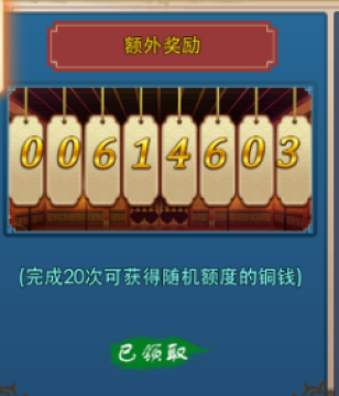 完成20環任務後,點擊“領取獎勵”還能有隨機額外銅錢,看看能給你多少驚喜!