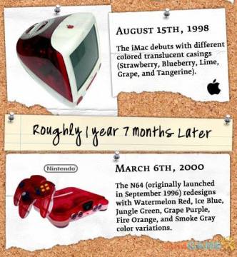 故事要從1998年開始說起,那一年的8月15日,蘋果發布了第一代iMac的時候,任天堂就悄悄盯上了……然後到了2000年的3月6日,任天堂N64發布,咦這個顏色和設計腫麼和iMac這麼像啊親?