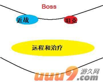 Boss戰的場地選擇有很多,標準是開闊平坦不卡視野,不會引小怪。以下給出一種場地選擇及其站位圖,許多公會也選擇這片場地左側的區域: