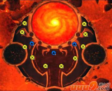 P1全場分散保持6碼以上站位,近戰區也要注意分散。防止薩格拉斯之怒一點打中超過1人。保證治療覆蓋。圖如下: