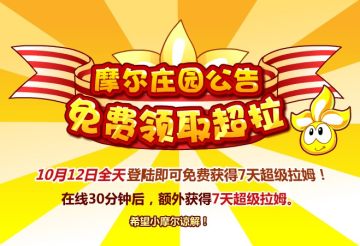 摩爾莊園由於係統問題在十月一日“超級拉姆免費送”的活動中導致部分玩家沒能領取到免費的超級拉姆,為補償未領到的玩家再次舉辦免費領取超級拉姆的活動。