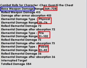 最後的403+72+73+36=584就是你攻擊後從怪物頭上冒出來的數字,因為我用的是第一層來說明,怪物基本沒有元素抗性。從武器上的屬性很容易推斷出如果還有冰,電屬性傷害,也是同樣的方式計算。