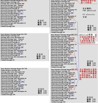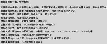 元素傷害最大值(屬性麵板)=(武器基礎元素傷害最大值+武器附魔元素(包括fire,ice,electric,poison)傷害)*(1+對應屬性加成+魔法屬性加成+對應武器專精加成+雙持加成+對應攻擊方式加成+傷害加成)+(項鏈戒指元素傷害+鑲嵌寶石元素傷害)*(1+魔法屬性加成+傷害加成)+鑲嵌寶石physical傷害