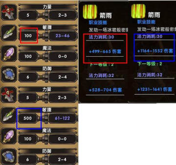 實例,弓MM的25級箭雨技能就受敏捷加成50%,在敏捷100時箭雨技能顯示傷害為499-665,根據公式算出基礎傷害
