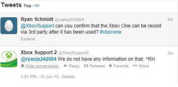 自從被爆出二手遊戲交易受限製和24小時在線驗證機製後,微軟XBOX ONE主機飽受玩家質疑,如果玩家買了XBOX ONE後不想玩了,能把它再度賣掉嗎?對此有玩家詢問了XBOX官方推特,微軟工作人員表示他們目前沒有這方麵的消息。