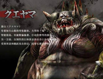 有著如大山般的誇張軀體,大型的鬼。智能很高,又被欺騙偷襲、行動狡猾等的報告。另一方麵,壓倒性的巨體放出的攻擊十分具體有威脅力。收到突進和跳躍攻擊的話,連骨頭都會碎掉。