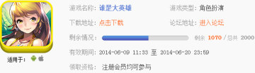 《誰是大英雄》激活碼領取方法 來源: 飛翔小編 2014/6/12 9:57:59 瀏覽量:349 3D武俠手遊誰是大英雄已經開測了,遊戲玩法豐富更有精彩的PVP對戰係統,下麵給大家帶來遊戲激活碼領取方法。誰是大英雄激活碼領取地址激活方法:1、進入官網下載遊戲(hero.changyou.com)2、進入賬號登陸頁麵,注冊賬號3、驗證頁麵填入遊戲激活碼,點擊“激活”4、完成激活,進入遊戲激活碼有效時間:2014年6月10日-2014年6月20日