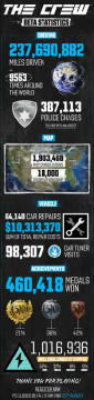 育碧最近放出了《法外之徒The Crew》Beta測試的統計數據圖表,圖表中顯示了總駕駛裏程數,警察追逐,車輛修理費,獎牌獲得數,環遊世界的次數等!目前已經公布了第二次Beta測試時間為8月25-29日(PC),《法外之徒》將於11月11日正式發售,敬請期待。