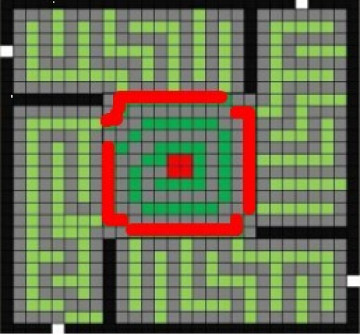 就在我剛才說這圖的時候 隨意發威的一個想法,並不是最完美的使用此圖。因為我智商不可能是最高並且沒有細化去研究(因為我喜歡自由發揮下麵會講)中部先圈個G行的中間,左上、右上、右下則先造靠牆的,如圖了。兵種很關鍵不需要便宜的來搭路,隻要覺得哪個兵種輸出最給力(遠程範圍輸出最佳)不需要建了在拆,一直用到最後接下來就繼續做圖。