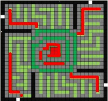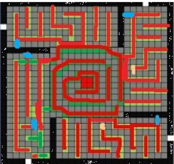 藍色一開始也造後麵圍差不多了撤掉就可以,左下綠色最後圍起來的時候+上大概就是這樣。可以用最便宜的兵放在藍色上麵,這個圖的好處就是不需要多少配合。隻要最後後麵中間快成型的時候,提示藍色撤掉就撤就OK (橘黃是紅色畫過頭 擦的)個人覺得這樣雖然路短了那麼幾格,但是兵反而多了好幾個並且操作簡單。此圖是後麵在一起玩的夥伴一起整的圖,不會弄圖隻能用別人的圖來塗鴉了大家見諒!