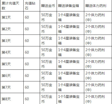 活動內容:每天充值達到60鑽石,即可在活動中心領取50萬金幣及高星裝備箱和體力藥劑,每日僅限一次。